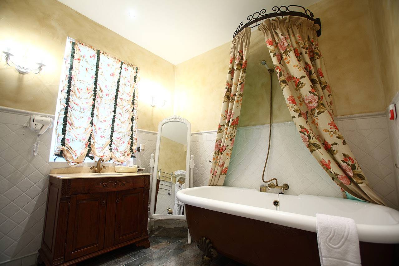 Классика. Ванная в классическом стиле напоминает в большей степени жилую комнату. На окно, если оно есть, в большинстве случаев вешают изысканную портьеру.