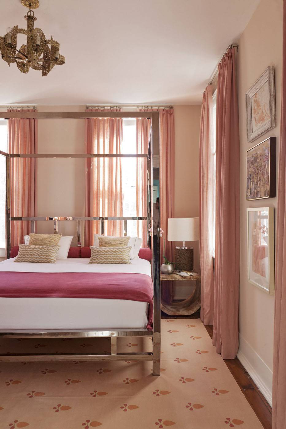 Розовый цвет подходит не только для маленьких девочек. Пример на фото выше показывает отличную идею с участием блестящей конструкции с навесом, но без драпировки. Пусть это вас не беспокоит, шторы от пола до потолка, украшающие окна, отлично уравновешивают общий замысел этого Charleston home от дизайнера Angie Hranowsky.