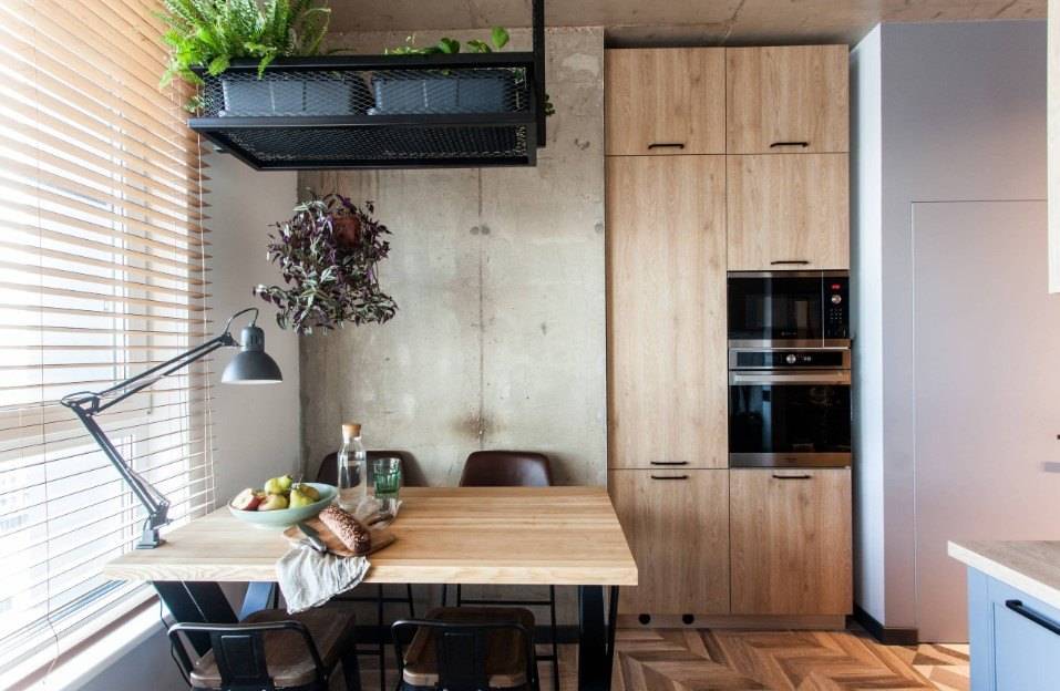 Такое оригинальное решение выполняет роль и обеденного стола, и барной стойки, и системы хранения, что позволяет полностью или частично избавиться от шкафов на кухне.