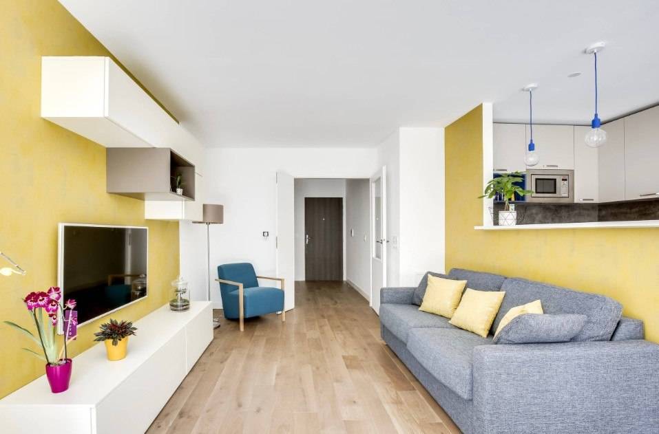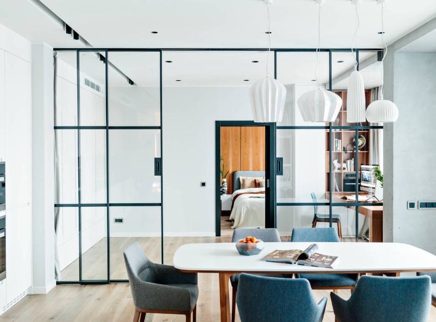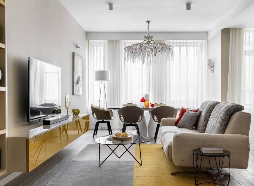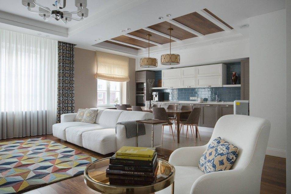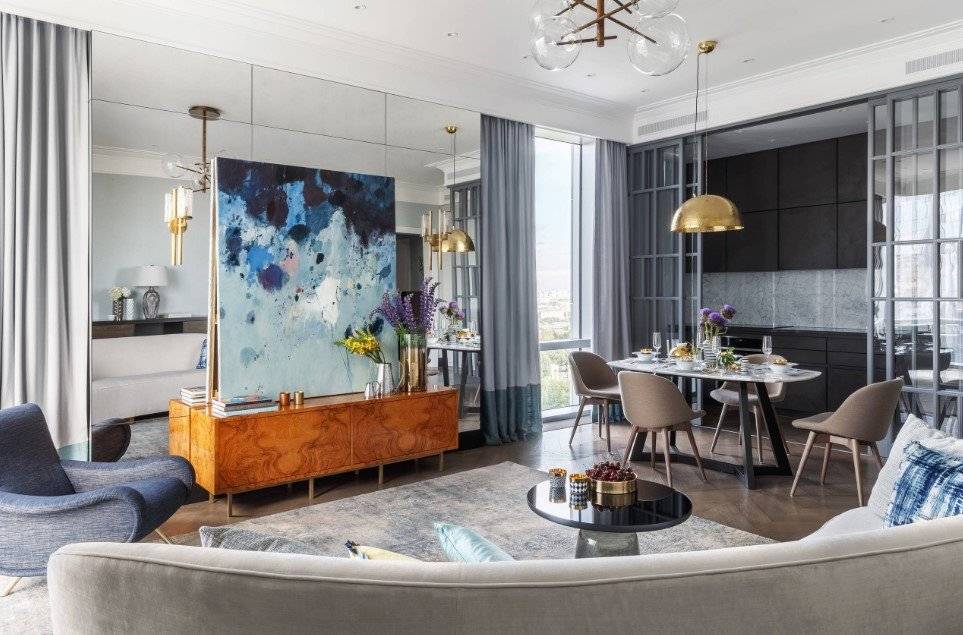 Не смотря на все «против» в 2021 году, проектировщики продолжают совмещать между собой кухонную зону и гостиное пространство, одновременно разделяя их раздвижными панелями и оригинальными перегородками, которые чётко определяют границы. Такая реконструкция позволяют заниматься приготовлением еды, не прерывая общения с гостями или остальными членами семьи, что, по мнению психологов, делает общение более близким.