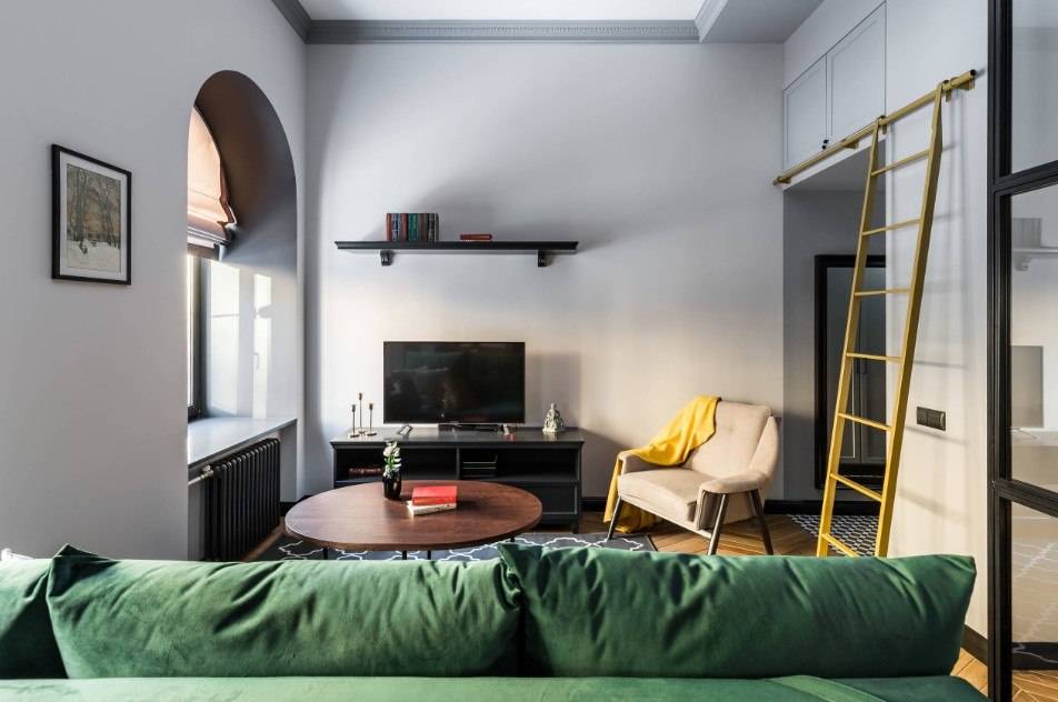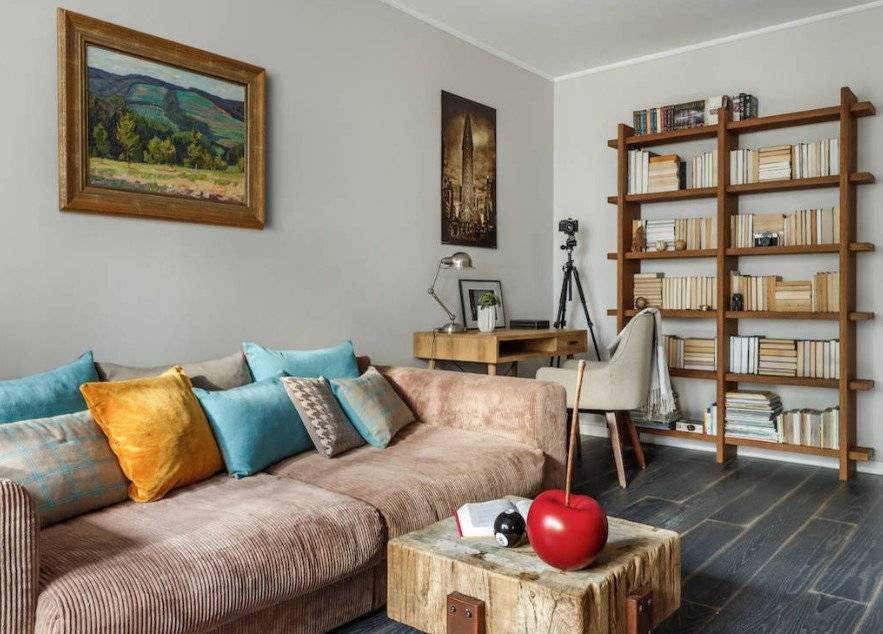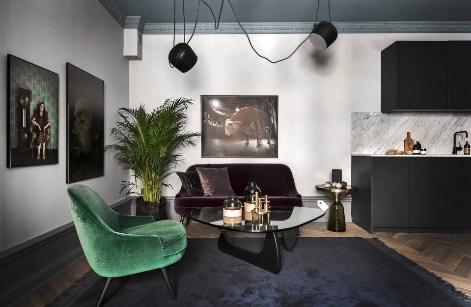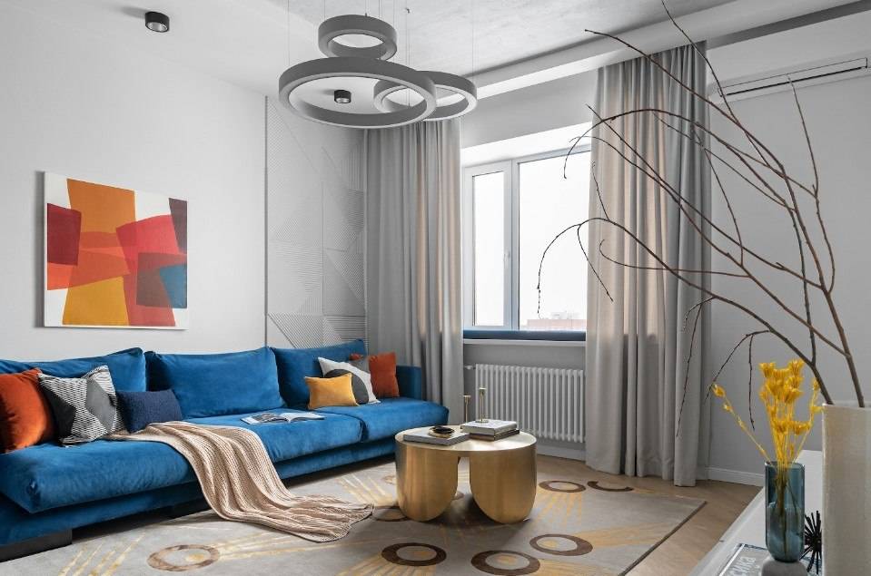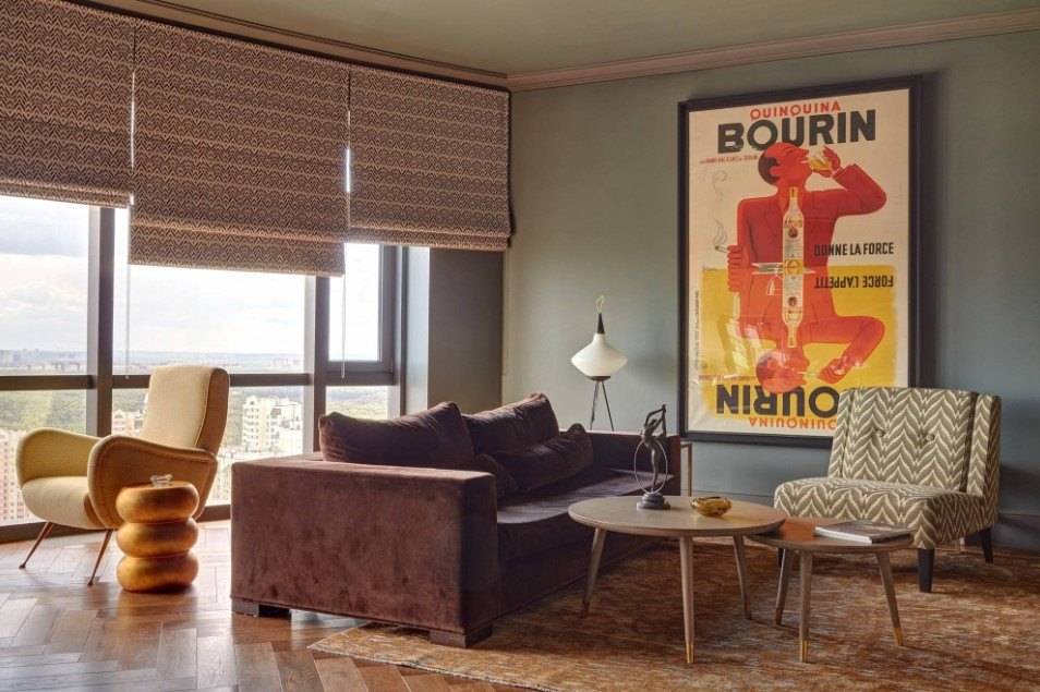 Обязательные детали – бархатная обивка и мебель с отголосками из далёких 70-х. Бархат обладает очень приятной текстильной фактурой и идеально дополняет как современные, так и классические стили оформления. Такие оттенки как изумруд, розовый гранат или сапфир не оставят вас равнодушными. Для стен в такой гостиной следует выбрать однотонный вариант отделки. Что касаемо мебели, то речь не идёт о полном копировании моделей из прошлого. Плавные линии и округлые силуэты дивана, кресел или симпатичного пуфика прекрасно адаптируются к скандинавскому, минималистичному и многим другим стилевым решениям.