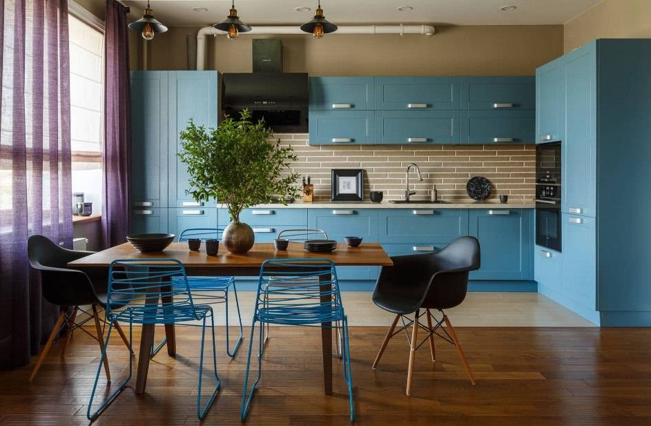 Дополнение дизайна металлическими материалами актуально в этом году как никогда. Как вариант, это может быть вытяжка, обшивка или декор «острова», покрытие или отделка фасадов, а также смесители, ножки стульев или светильники.