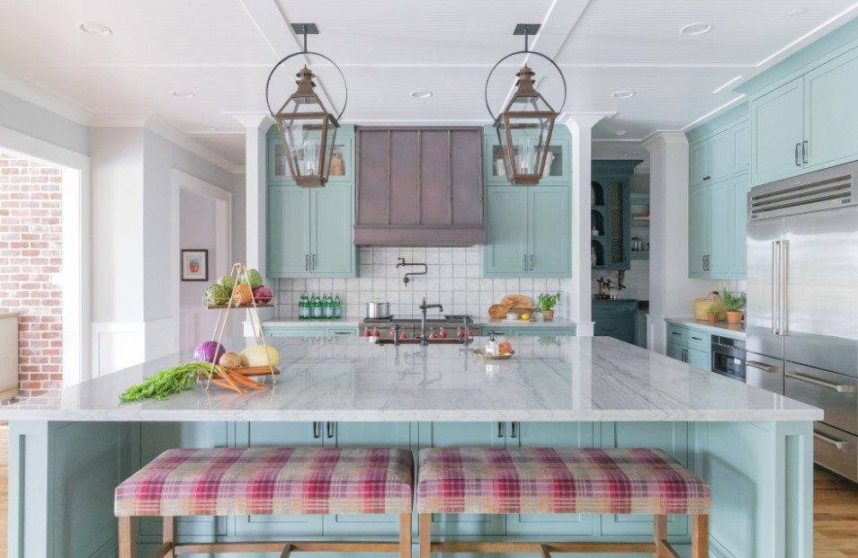 Среди цветовых фаворитов можно выделить синюю и зелёную палитры, которые могут быть красиво дополнены классическим белым, серым, розовым или терракотовым оттенком.