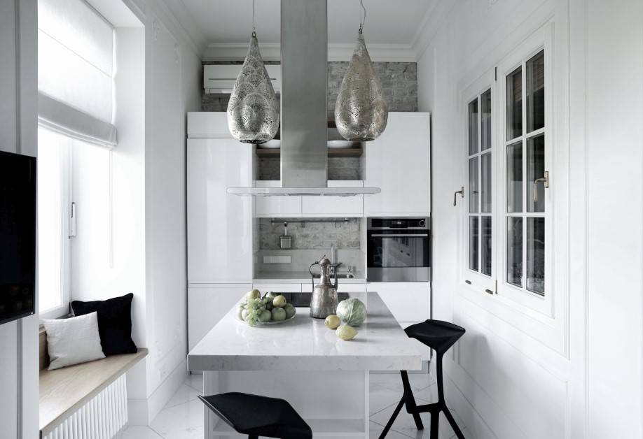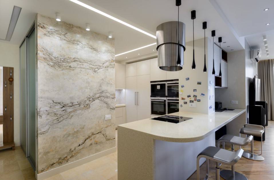 Такой материал как мрамор, всегда смотрится элегантно, поэтому его можно смело использовать даже в минималистичном стиле. Это идеальный выбор для изготовления столешниц, островной конструкции или барной стойки. Также мрамор довольно часто используют для покрытия полов.