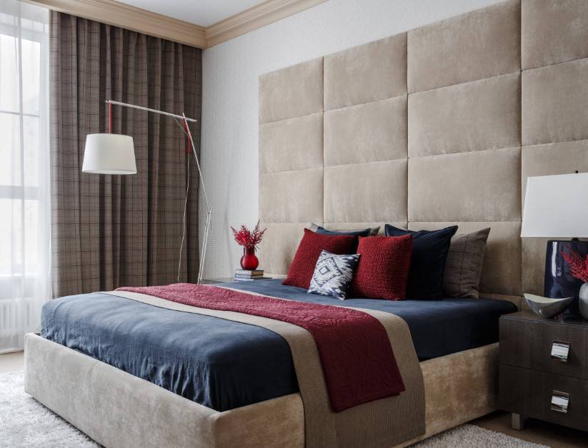 В 2021 году очень модно украшать изголовье кровати обивкой. Если ранее предпочтение отдавалось деревянным конструкциям, то сегодня на первом плане объёмные кожаные или тканевые спинки с чётким геометрическим рисунком.