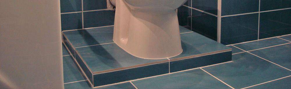 В первую очередь это маскировка стыка унитаза и пола. Если контур первоначального отверстия значительно больше, чем подошва нового унитаза, можно замаскировать стык при установке на цемент с помощью мозаичной плитки или выполнить небольшой подиум.