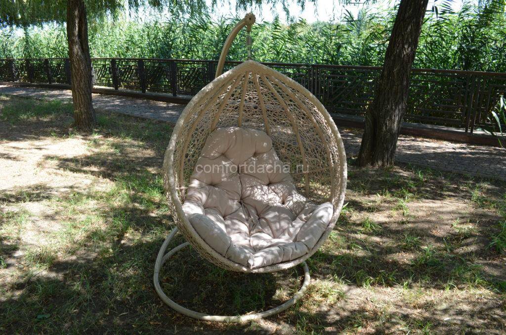 Самый примечательный вариант для изготовления подвесных качелей в виде яйца – это кресло кокон из ротанга. Для этого изделия применяют природный материал и кресло смотрится красиво и естественно. Таким же образом можно сделать кресло и из виноградной лозы, черемухи, ивовых веток.