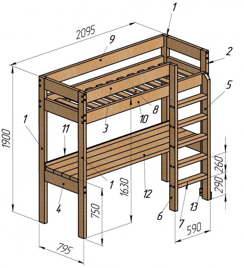 - Последний этап сборки — прикрепить ограждения (перила), прикрепить конструкцию к полу или к каркасу кровати.