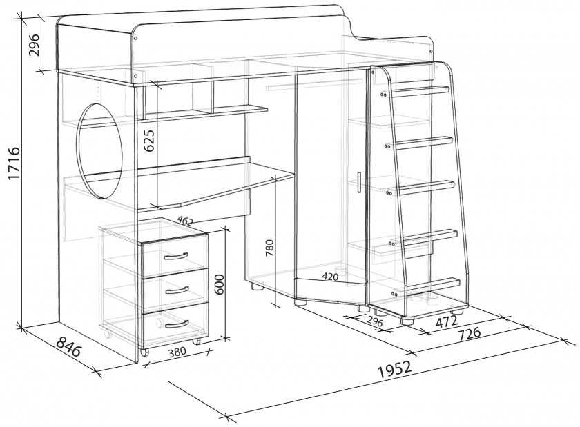 Каркасы для взрослой кровати-чердака бывают высокими (1600 – 1800 мм) и низкими (1300 – 1600 мм). Высоту конструкции выбирают в зависимости от высоты потолка и способа использования нижней части конструкции. Так, при организации рабочего места или зоны гостиной должна быть возможность выпрямиться в полный рост.
