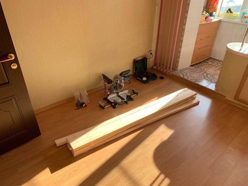 Подложил под брусок подпорки, чтобы он оказался на одном уровне с прочерченной в 5 см от пола линией (и с двумя другими опорами). Нанес клей и вкрутил саморезы.