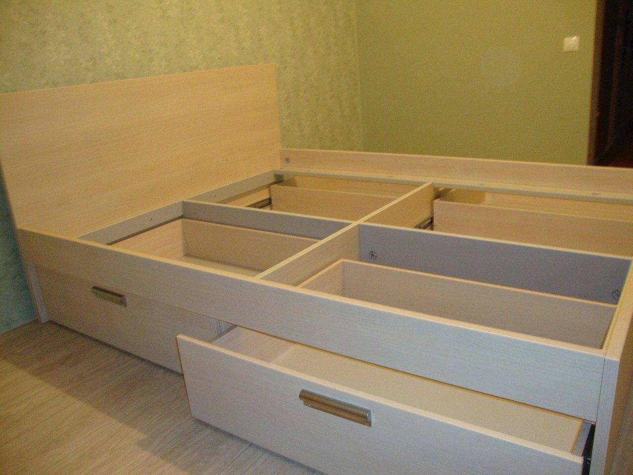 - основание кровати, которых два. Если это металлический каркас на ножках (ортопедическое основание), то короб для ящиков будет формироваться вокруг него. Если матрас лежит на ламелях или ЛДСП, то короб кровати будет несущим;