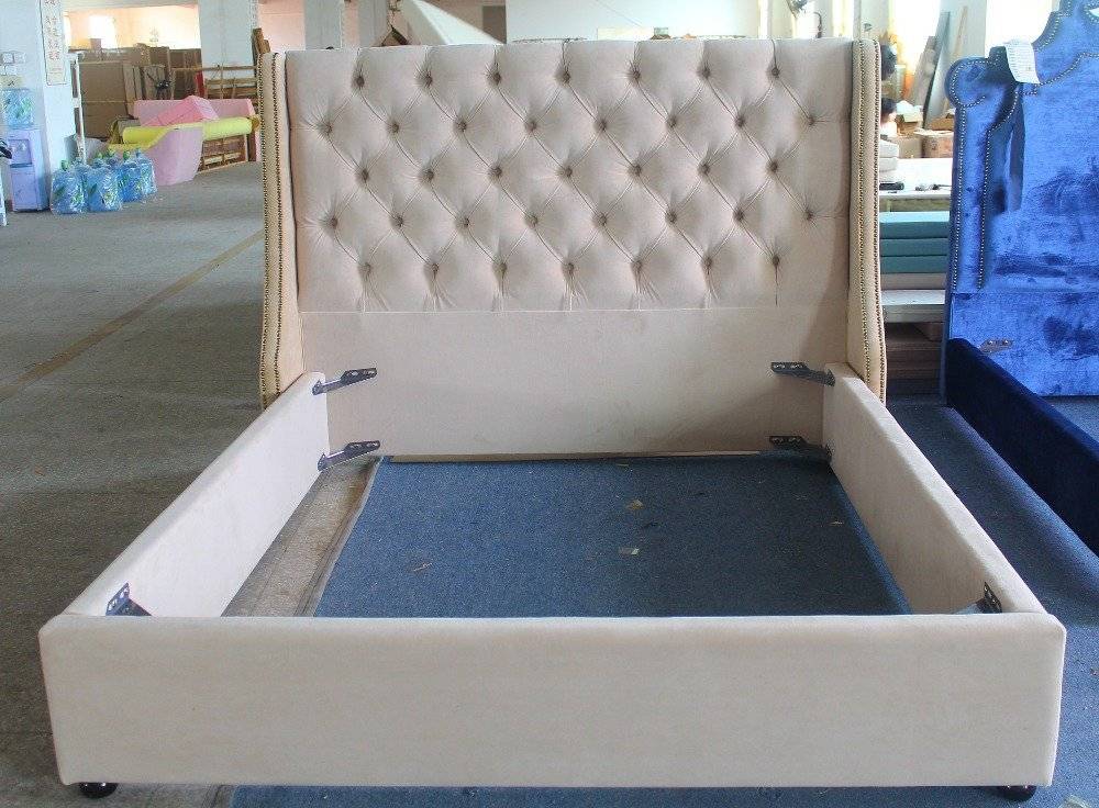 Можно оббить спинки изделия текстилем. Но лучше всего, оформить тканью только ту часть каркаса, где не будет застилаться покрывало.