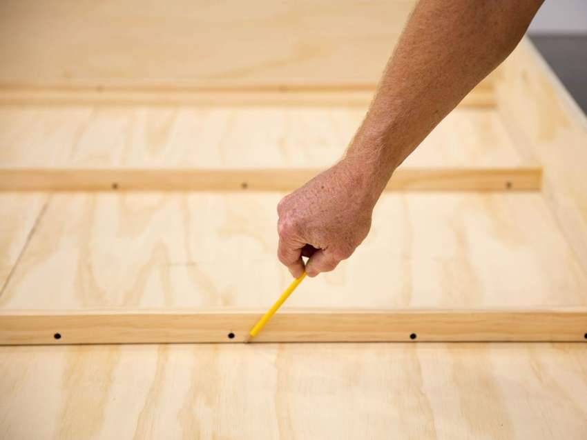 - Лист фанеры предварительно усильте вертикальными досками, чтобы он не прогибался, а потом прикрепите к коробу.