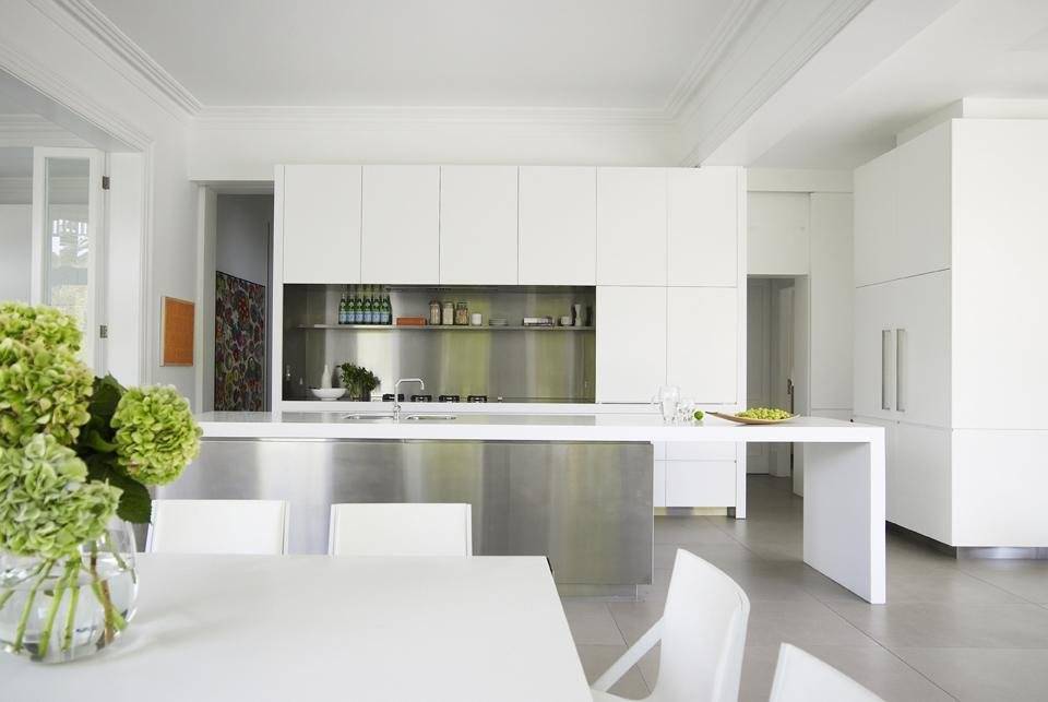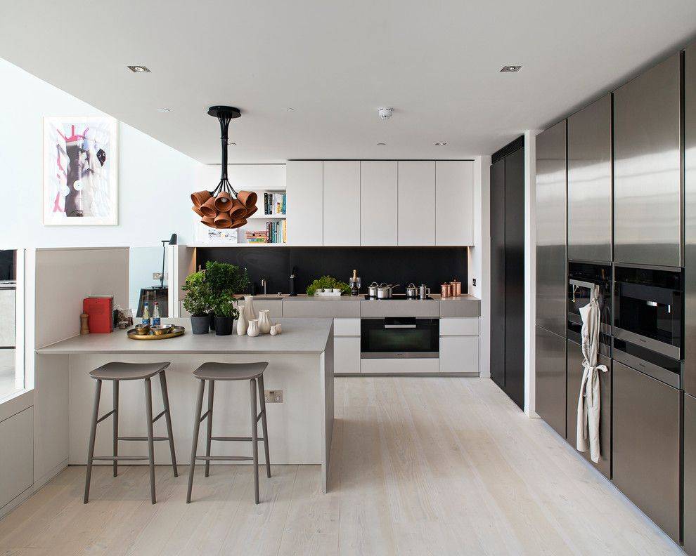 Как и любая стильная современная кухня требует тотальной встроенности всей техники и мебели — не должно быть тёмных углов, верхних шкафов не до потолка, отдельностоящих плит и микроволновок.
