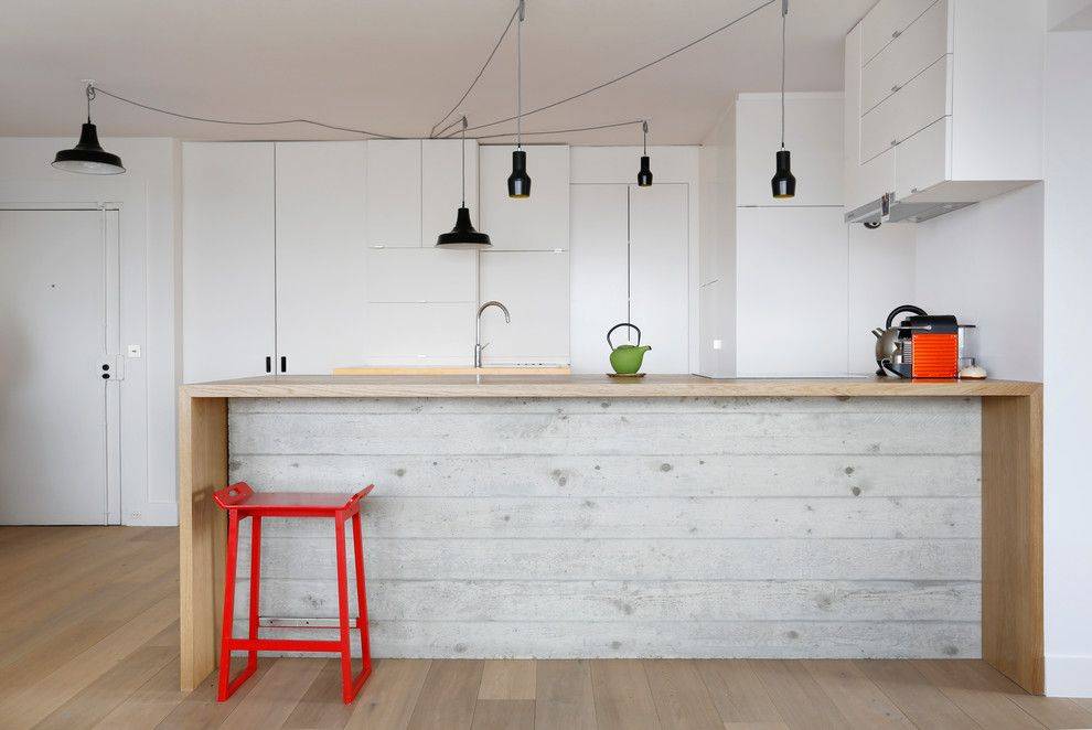 Стандартное сочетание не тянущих на себя внимание цветов — белая кухня с деревянной столешницей. В таком исполнении даже лёгкий беспорядок не разрушит ощущения минимализма, плюс это практично и недорого