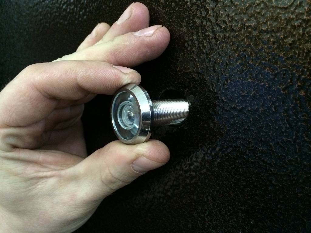 Закрепляется глазок. Для этого его следует придерживать с внешней стороны и вкручивать с внутренней. Если в комплекте есть ключик, то можно дополнительно зажать узел изнутри.