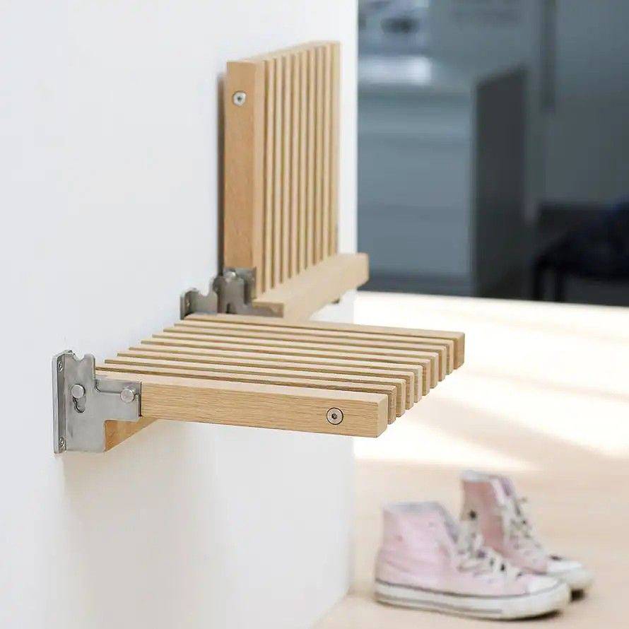 Главное и единственное достоинство заложено самой идеей откидного стула: он занимает место только тогда, когда он нужен. Затем сиденье прижимается к стене (перегородке, колонне) и практически исчезает.