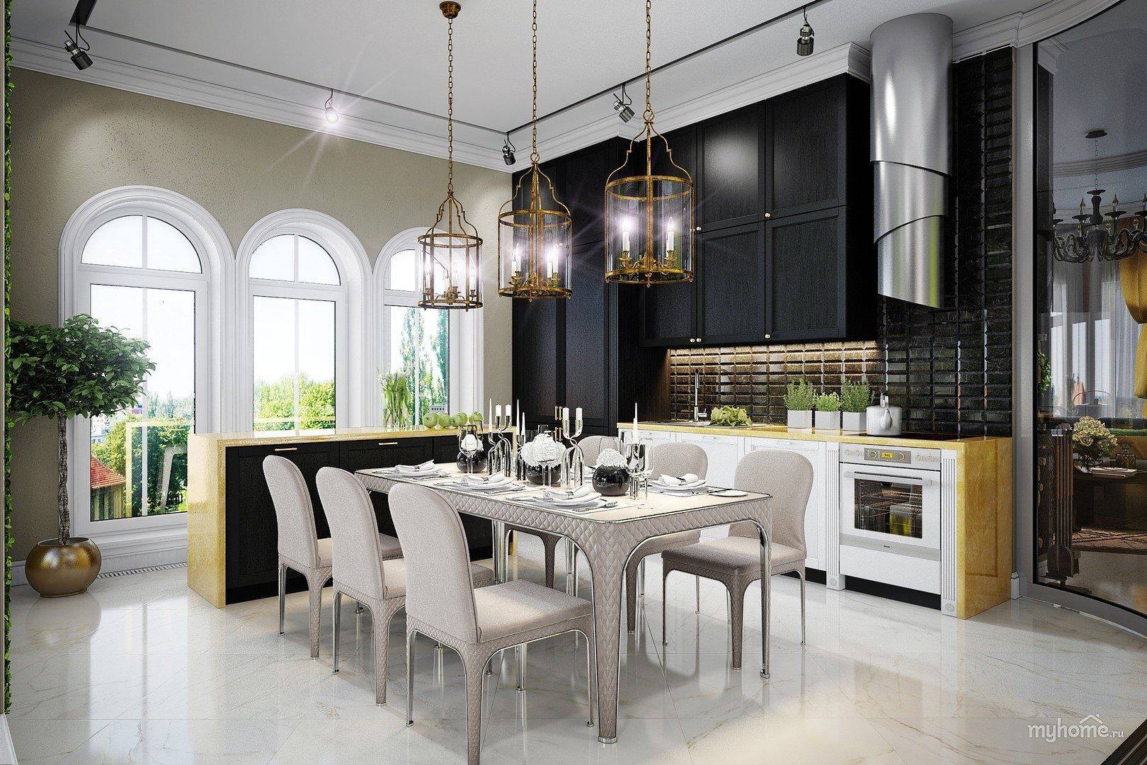 Сдержанная эклектика для кухни большого загородного дома. Черно-белый контраст всегда выгодно смотрится в интерьере.