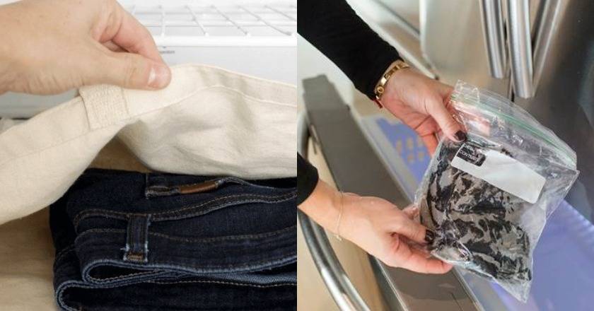Чтобы избавиться от неприятного запаха старой вещи и болезнетворных микроорганизмов, следует подержать несколько часов стираную и сухую одежду в морозильной камере. Вещь аккуратно сворачивают, помещают в чистый пакет и кладут в холодильник.