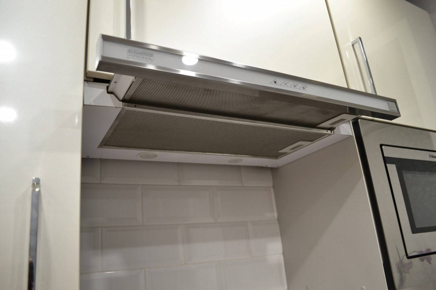 - Полностью прячется в кухонную мебель и не портит интерьер.