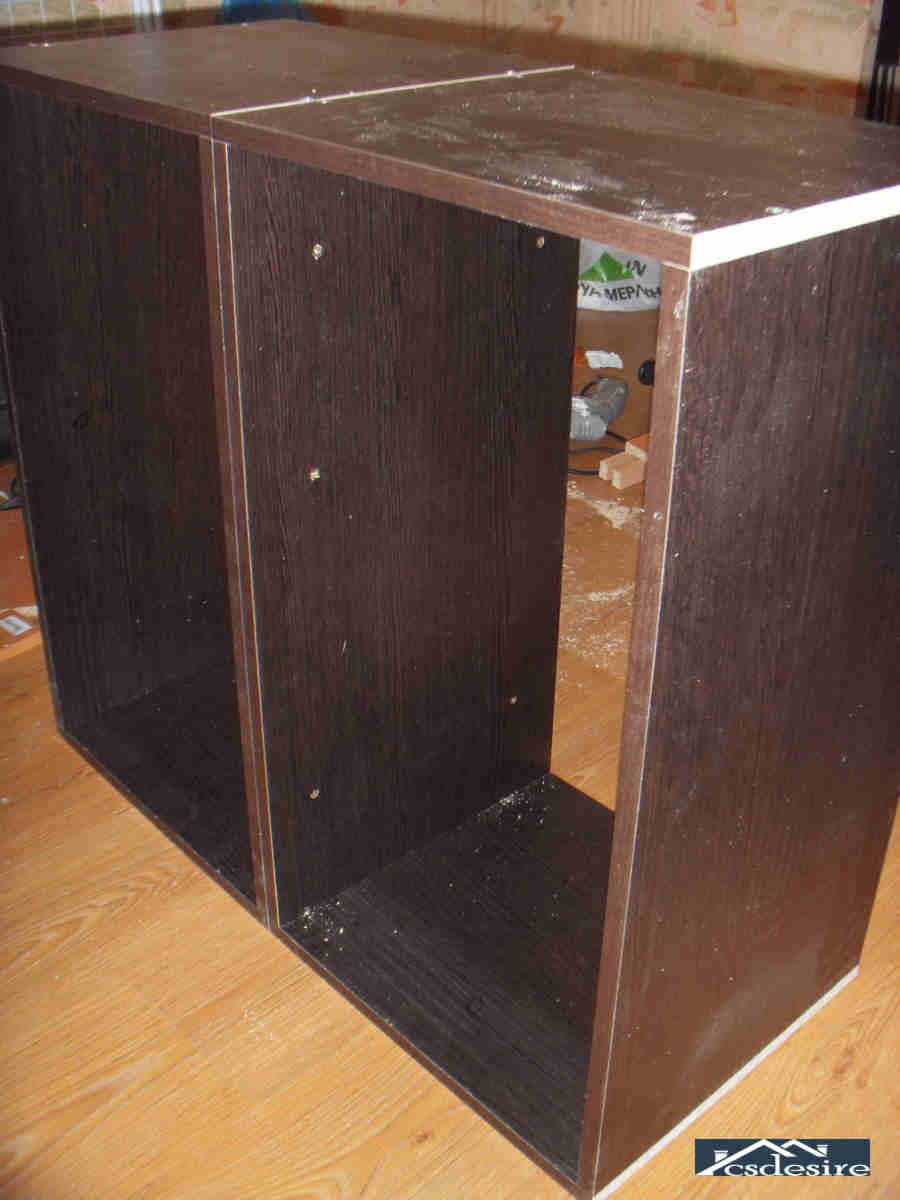 Устанавливается подготовленная под мойку тумба. При сборке тумбы на верхних торцах устанавливаются Г-образные уголки из пластика с пазами, на которые насаживаются края раковины.