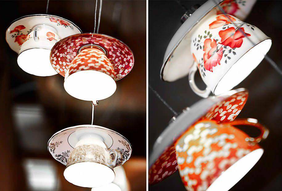 Чайные чашки. Старый вышедший из моды сервиз способен превратить обычный каркас люстры в шедевр. Чайник располагается в центре самой люстры, а чашки с блюдцами – по краям. В зависимости от конструкции каркаса, чашки можно разместить донышком кверху или книзу.