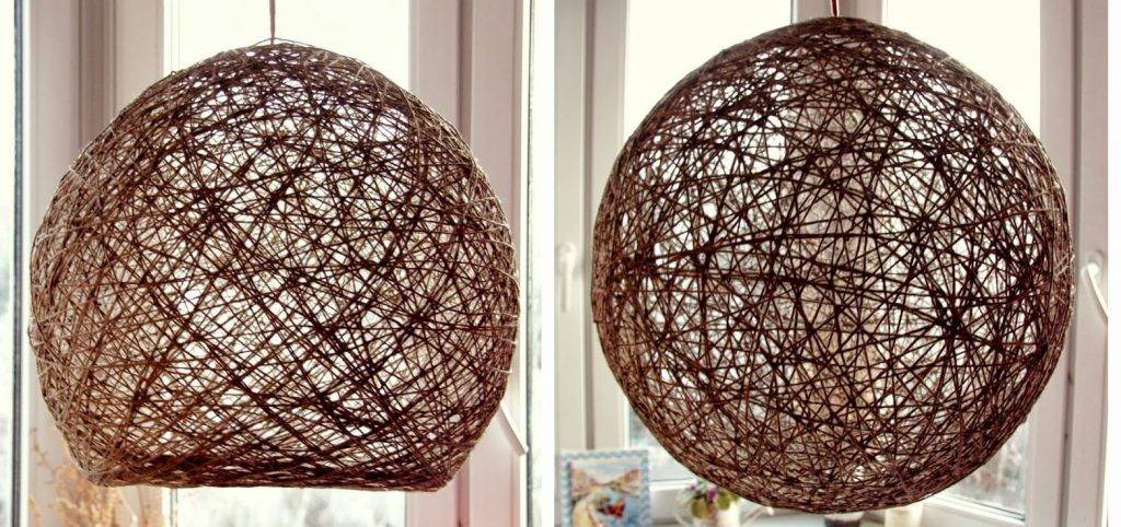 Конструкцию следует оставить для полного высыхания на пару суток. После этого шарик сдувается и аккуратно вынимается. Получившийся абажур подсоединяют к подвесу.