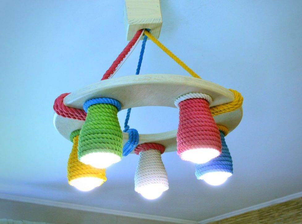 Все эти материалы не поранят ребенка, если даже они пострадают при игре. Так же люстру можно еще сделать из такого необычного материала, как воздушный шар или линейка. Смастерить можно не только люстру, но и светильник или бра на стену. Все эти поделки преобразят комнату, и малыш будет им очень рад.