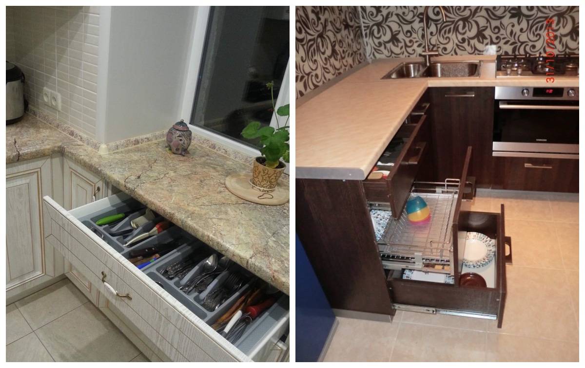 Хранить там можно практически любую мелкую кухонную утварь: от столовых приборов и половников до небольших емкостей и компактной бытовой техники.