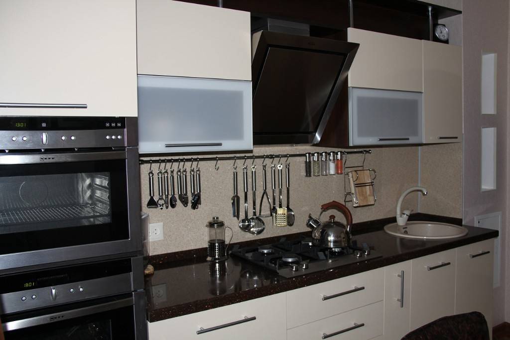 Рейлинги — оптимальный вариант хранения кухонной утвари на маленькой кухне.