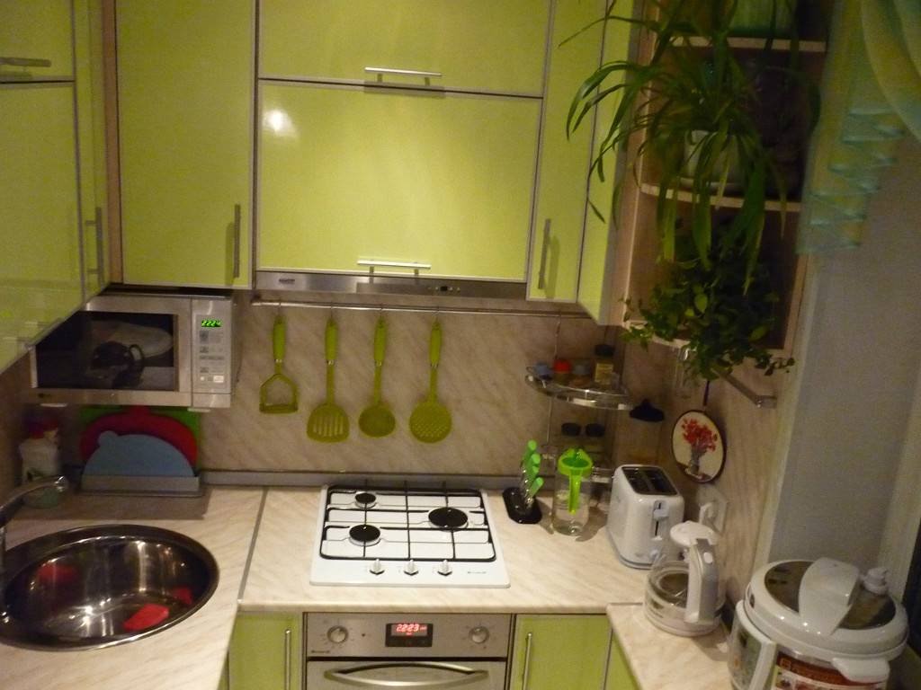 Обустраивая небольшую кухню, следует отказаться от массивной мебели, которая занимает слишком много места, и при этом не является особо функциональной. В таком помещении нет места декоративным сервантам и витринам с выставленными на обозрение изящными сервизами. Необходимо подобрать компактный гарнитур, каждая полка которого будет максимально полезной и востребованной.