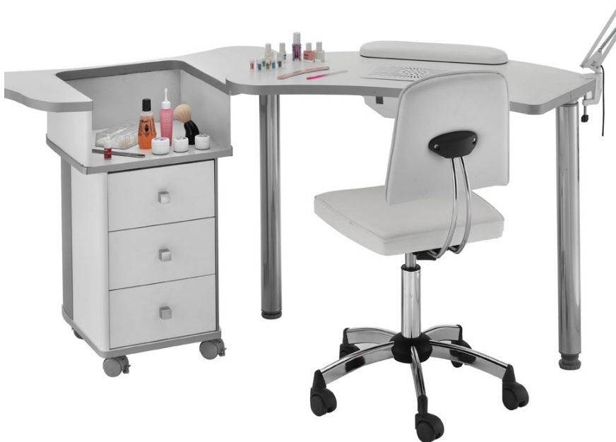 Столик для маникюра специально разработан для удобства и клиента и мастера. Выглядит такая мебель, как привычный стол, оборудованный всевозможными ящичками и полочками. Модели различаются формой, размером, комплектацией, дополнительными устройствами. При разработке стола учитывается, что за ним должно сидеть два человека друг напротив друга, не соприкасаясь ногами. Поэтому стол должен обеспечивать большое пространство для ног. Это достигается тщательной подборкой формы стола. Лучше, когда это будет не простая прямоугольная конструкция, а изогнутая определённым образом.
