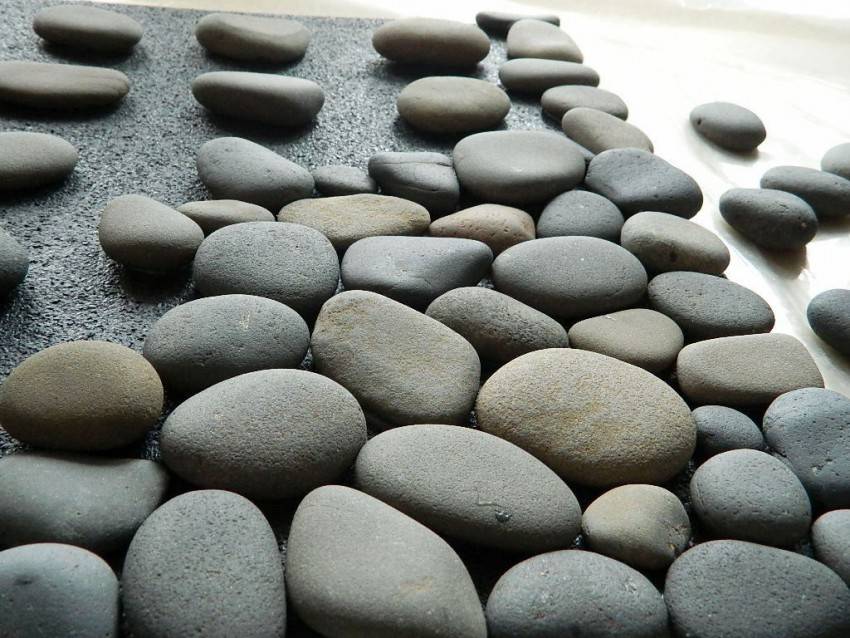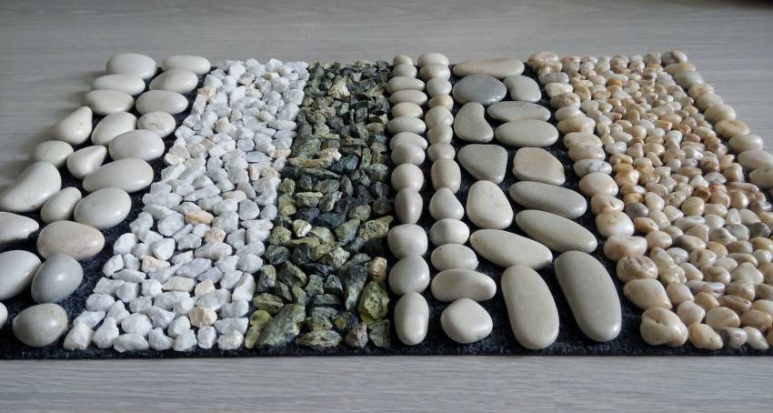Эта вариация самая широко применяемая, но в её создании нужно соблюдать ряд условий. Следует использовать материал круглой или овальной формы. Замечательно подойдёт галька — она должна быть одинакового размера. Подобрав нужное количество камешков, нужно промыть их мыльным раствором и, желательно, прокалить. Это обеспечит уничтожение бактерий и сделает их безопасными для здоровья. Далее необходимо осуществить следующие действия: