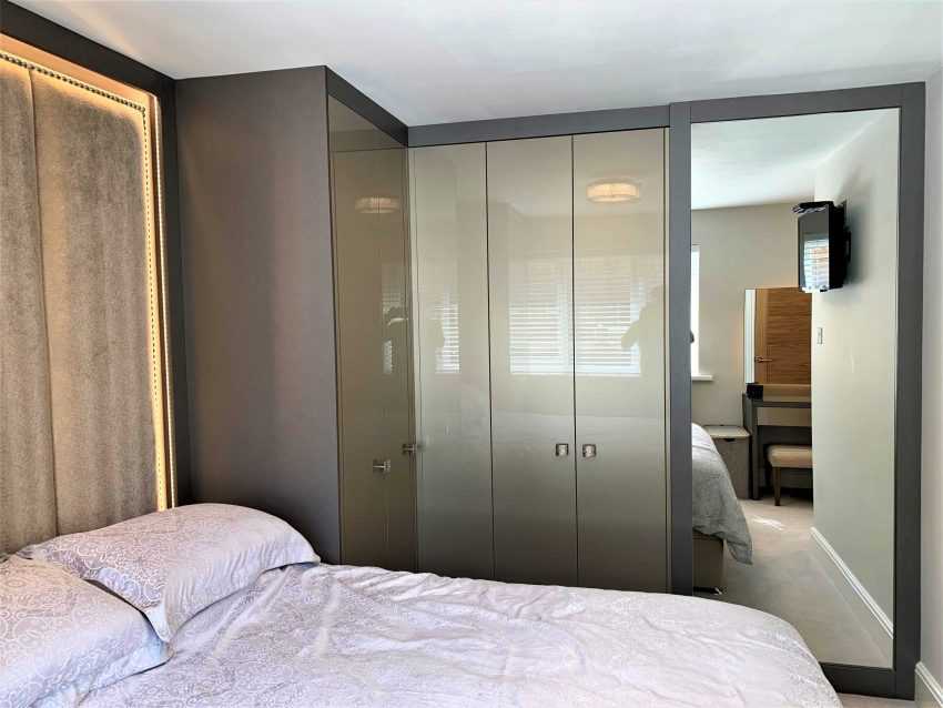 Фасады мебели (например, шкафа) можно оборудовать зеркальной панелью, что создаст интересный визуальный эффект при планировке небольшой спальни.
