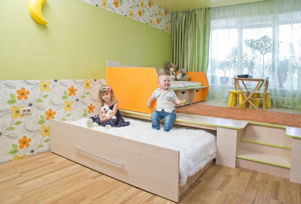 Ложе в такой конструкции расположено под настилом и выдвигается для сна. В остальное время конструкция находится в собранном виде и вся комната свободна.