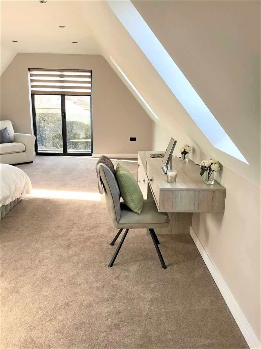 Мастер-спальня объединяет несколько функциональных зон благодаря чему позволяет хозяевам спокойно отдыхать и заниматься своими делами, не выходя за пределы комнаты.