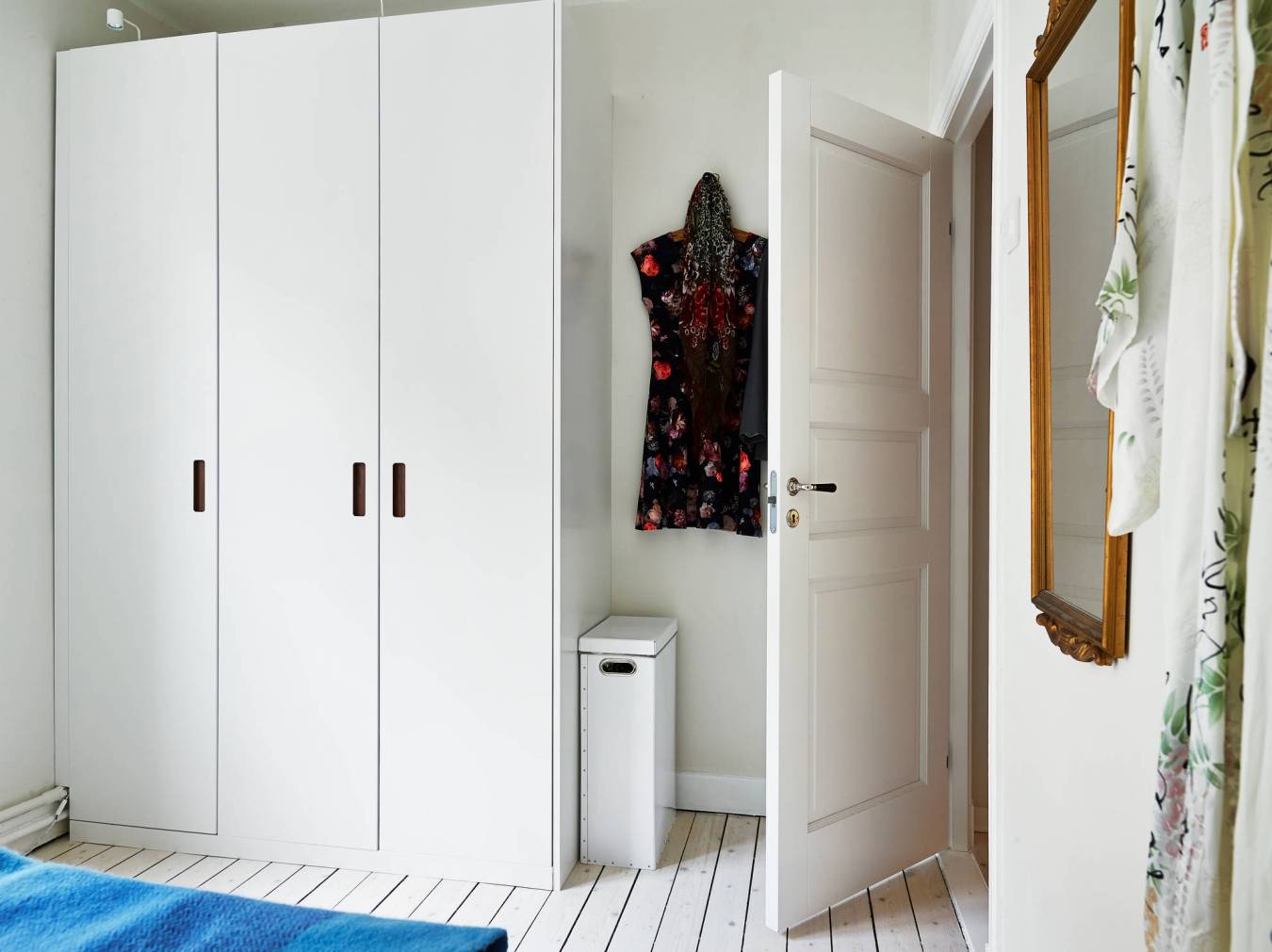 Шкафы в скандинавском стиле используются не громоздкие. Нередко обычные системы хранения заменяют комоды и прикроватные тумбы. Все это необходимо, чтобы оставить как можно больше свободного пространства.