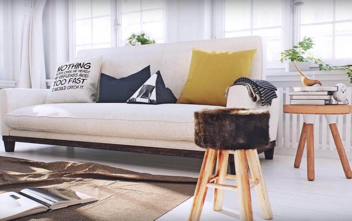 Чтобы создать скандинавский стиль с помощью изделий из ткани вам понадобятся несколько диванных подушек в ярких чехлах, ковер с ярким геометрическим рисунком, простые шторы в пол с принтом.