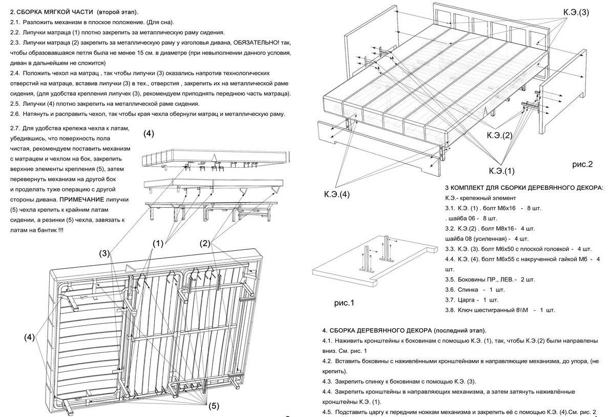 В стандартную комплектацию мебели входят: панели ДСП, текстильная обивка, поролон, матрас из трех секций, крепежные элементы (скобы, саморезы и гвозди), направляющие, колесики для выдвижной части, ножки для основы. Перед тем как быстро собрать диван «аккордеон», нужно изучить инструкцию, которая различается у разных модификаций.