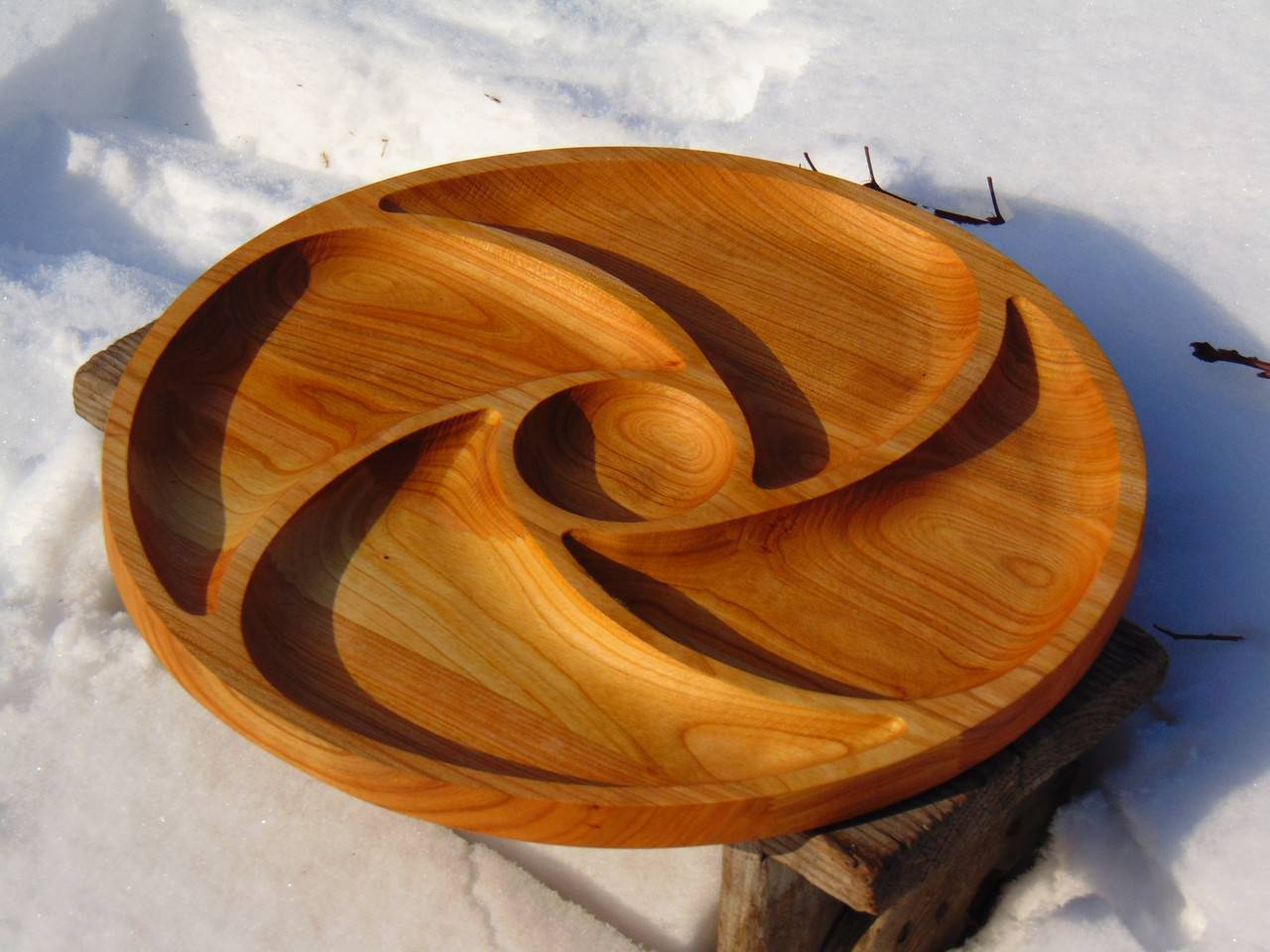 Секционные деревянные менажницы делают в нескольких исполнениях. Либо тарелочка с перегородками из целого куска массива. Либо подставка из дерева, а салатницы — из стекла или фарфора. Эти предметы покрываются лаком или их пропитывают маслом. Подают орехи, сыры, сухарики, мёд и варенье. Всевозможные хлебные изделия. Сочные фрукты и ягоды будут смотреться очень аппетитно, только тарелочка может разбухнуть от влаги и испортится.
