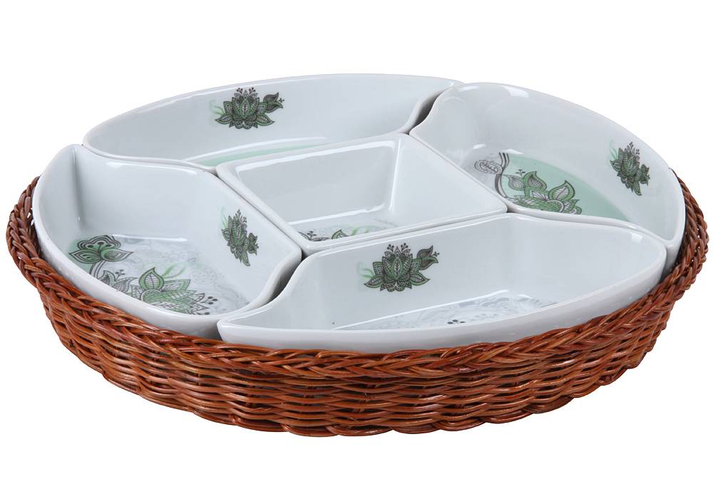 5 и более сегментов менажницы предназначены для размещения салатов, легких закусок, соусов и икры.