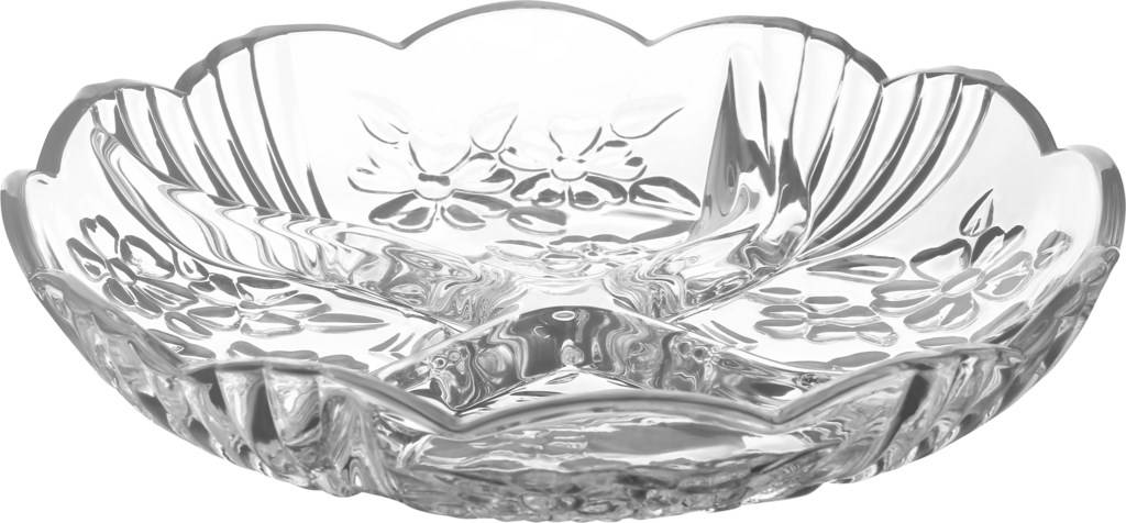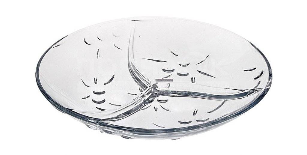 Недорогая модель, изготовленная из прозрачного стекла высокого качества, украшена рельефным орнаментом классического типа. Тарелка имеет круглую форму и разделена на 4 равные отделения. Pasabahce подходит для подачи овощной и мясной нарезки, салатов, любых видов блюд, закусок и десертов. Благодаря компактным габаритам менажница экономит пространство стола. Материал изготовления – натрий кальций силикатное стекло – позволяет мыть модель в посудомоечной машине. Размеры предмета – 27 см (диаметр), 5 см (высота). Средняя стоимость составляет 227 руб.