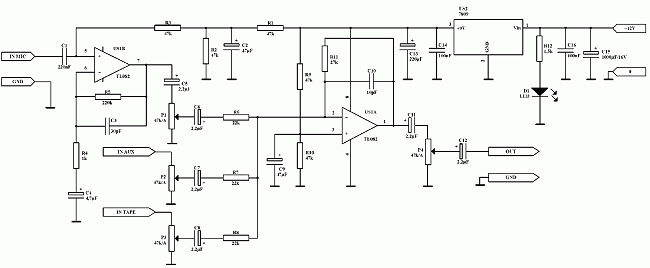 В конструкции звукового пульта применена одна микросхема, состоящая из двух усилителей. Один усиливает сигнал, поступающий от микрофона, а другой работает в схеме сумматора. Для регулировки входящих сигналов в аппарате применяются потенциометры, обозначенные на схеме P1, P2, P3.