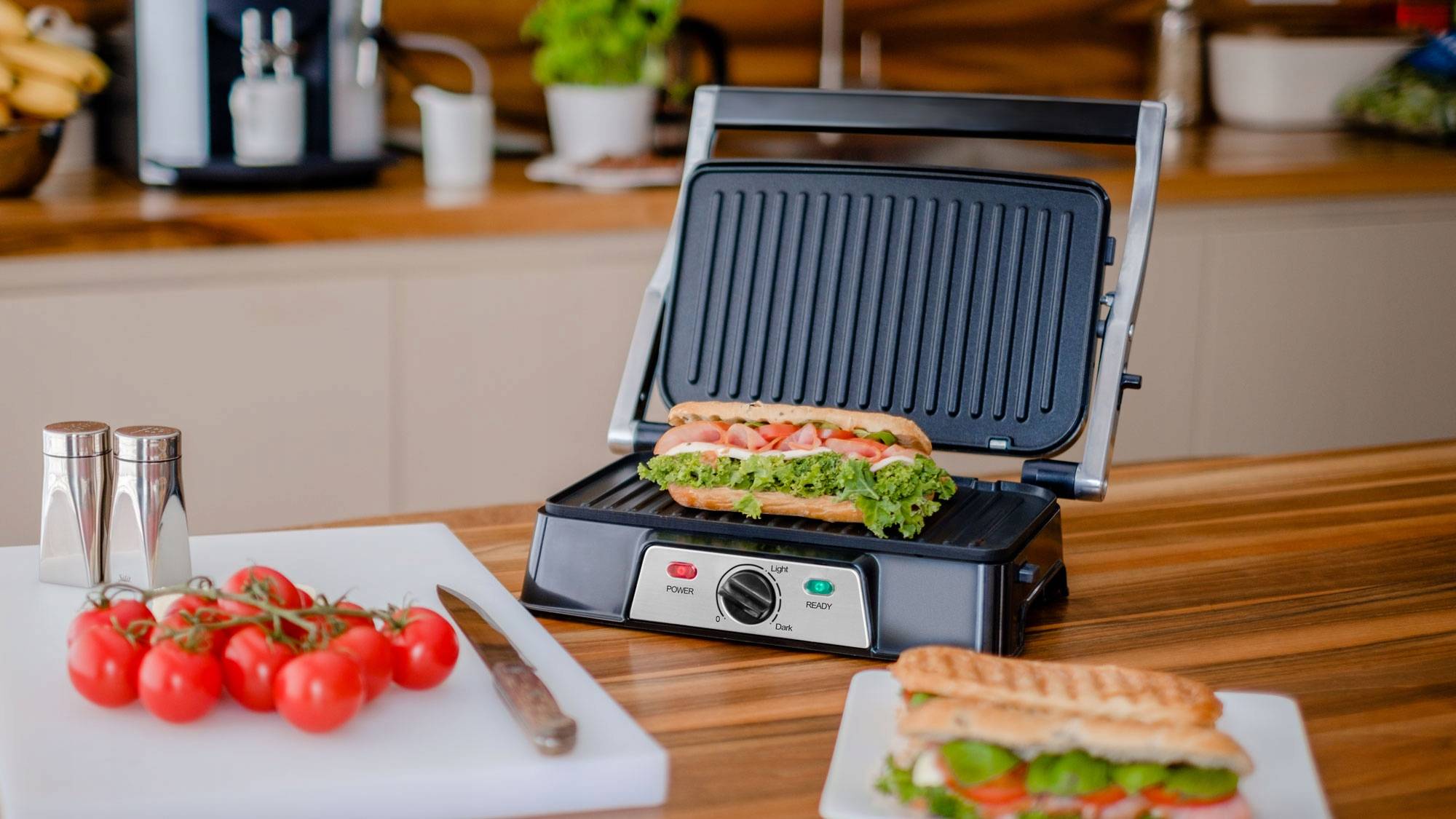 Максимальная температура жарки составляет 220 °С — этого достаточно, чтобы быстро приготовить стейк, поджарить овощи и хрустящие тосты. Интенсивность нагрева регулируется с помощью механического переключателя на фронтальной панели устройства.