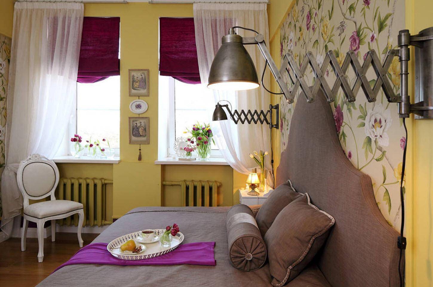 Спальня олицетворяет мир и спокойствие. Яркость и насыщенность интерьера часто неуместны. Вы можете выбирать шторы под обои радикально другого цвета, но интуитивно. Например, темно-серые обои будут выглядеть шикарно в дуэте с кораллово-красными занавесками, а насыщенно-желтые стены легко компенсируются белыми шторами.