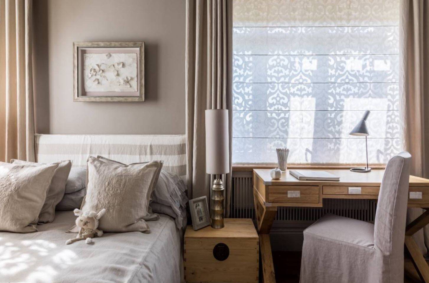 На фото короткие классические занавеси, которые не закрывают радиатор в спальне и открыли подоконник, как рабочее место или туалетный столик.
