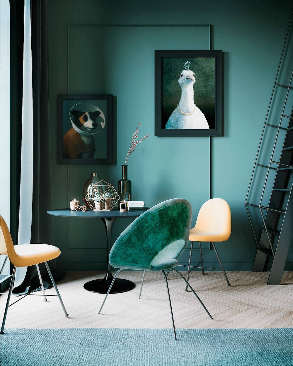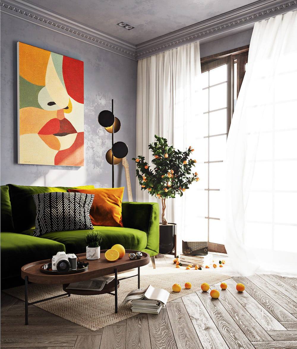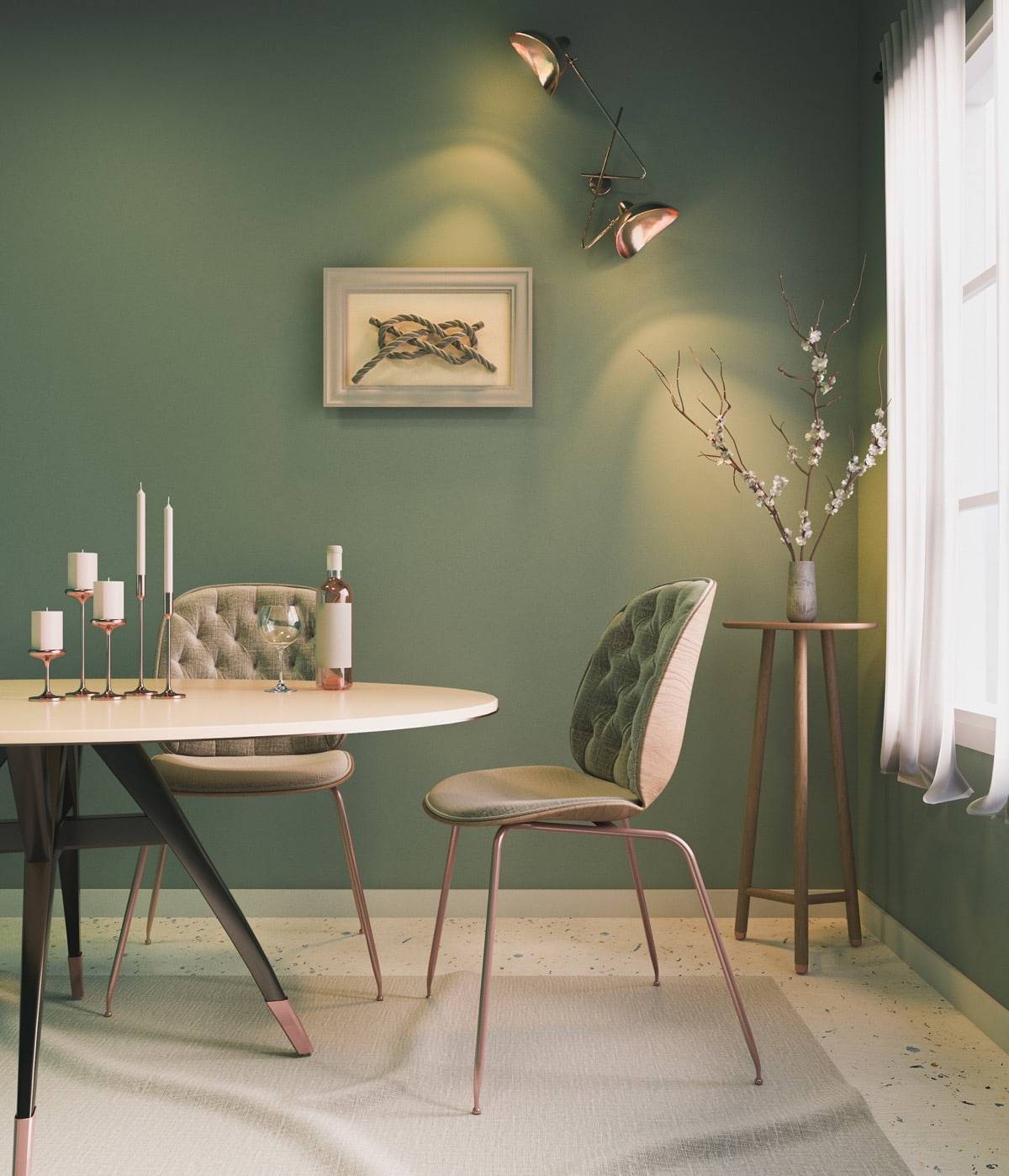 Консервативно настроенным людям приятно осознавать, что по-прежнему модным цветом в интерьере 2021 остается освежающий зеленый колер, который особенно будет актуален в интерьерах с элементами минимализма. Рекомендуется для оформления стен подбирать темно-зеленый фон, а для бархатистой отделки мягкой мебели использовать ультрамариновые или изумрудные цвета.