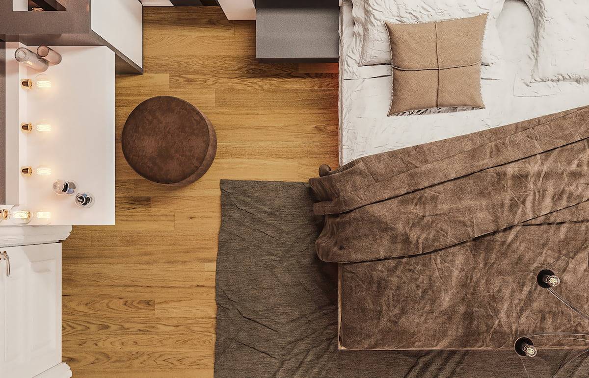 Для зонирования используют разные приемы. Можно покрасить поверхности стен, подобрав разные цвета. Интересный эффект получают, если оформляют разными по тону материалами пол или даже потолочную поверхность.
