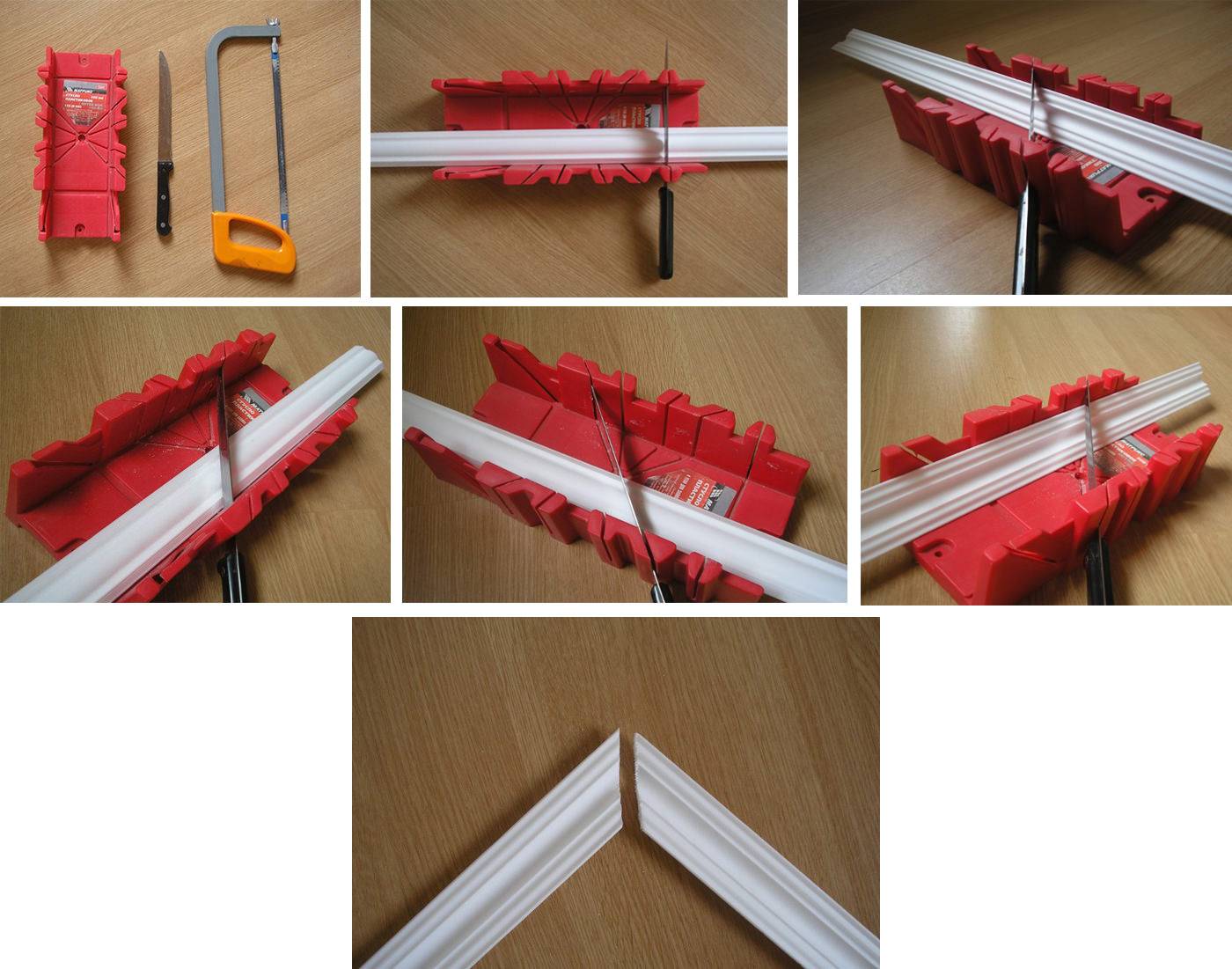 По углам галтели стыкуются под углом в 45°. Для формирования ровного стыка используется стусло. Багеты можно резать ножом или пилой. С ножом срез получается более качественным, бордюр не раскрашивается, не появляются заусеницы.
