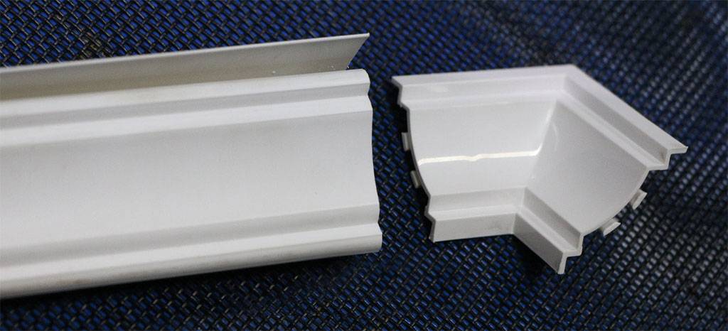 Молдинги из поливинилхлорида. Прочные, но негнущиеся детали, которые можно использовать для отделки квадратных или прямоугольных полотен натяжных потолков. В продаже бывают не только однотонные, но и окрашенные под древесину изделия. Белый поливинилхлорид, находящийся в условиях повышенной влажности или под прямыми солнечными лучами, со временем может пожелтеть, поэтому для кухни желательно выбирать покрытые лакокрасочным составом плинтусы. Тонкие детали легко разрезать канцелярским или строительным ножом, а для более широких молдингов используется ножовка.